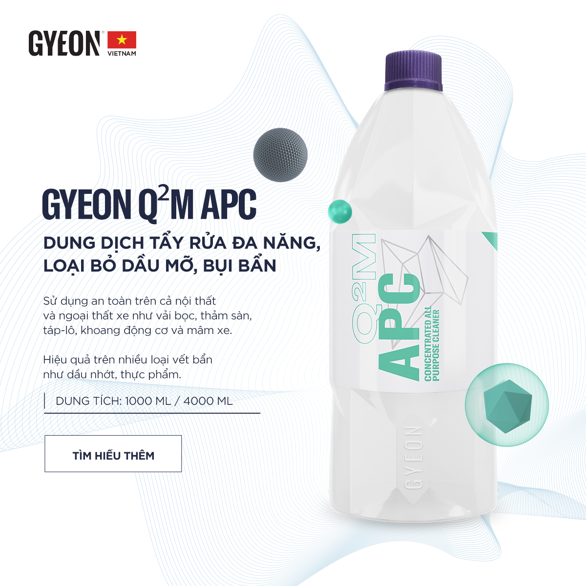 Q²M APC là dung dịch tẩy rửa đa năng thuộc dòng sản phẩm Q²M Maintenance của GYEON. Sản phẩm chuyên làm sạch dầu mỡ, bụi bẩn cứng đầu và vết ố lâu ngày. Dùng được cho cả nội thất và ngoại thất xe như vải bọc, thảm sàn, táp-lô, khu vực động cơ và mâm xe.